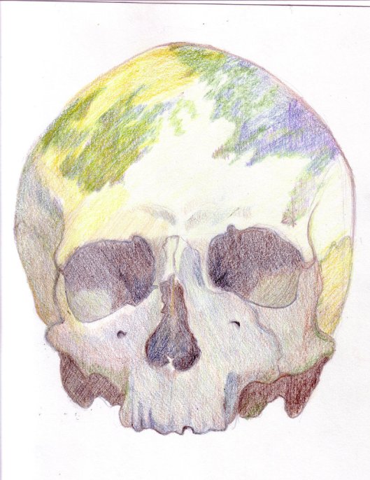 But now that I think about it after a few years of working on my self-esteem, I don’t think it’s lopsided after all. (And no, I don’t mean that it’s-a-cool-drawing-in-and-of-itself.) Rather, faces are lopsided; some more than others. And more to the point, after looking at the pic for some clues, I realize that the left side of the face (your right) is normal–and the right is noticeably different. The very fact that you don’t see the zygomaxillary suture there is something of a giveaway. My guess is that something got a little squished on that side in utero. I’m betting the people at the Naturalist Center didn’t see this skull as abnormal, just as I hadn’t when I was right there paying very close attention, so that my hand put down what my eyes were seeing. So it was him; that’s just the skull he had–and I didn’t “fall out of drawing,” as they say.